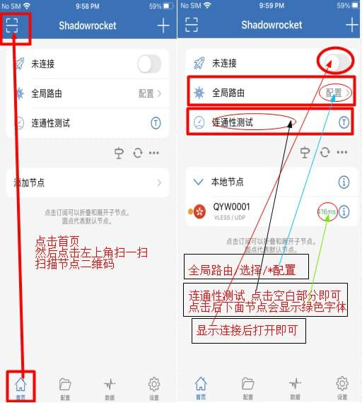 第二步:进入首页、扫描节点二维码。按提示完成即可开始遨游全球🌎(只需扫描客服给你的节点二维码,然后点击连接开关即可)点击连通性测试是为了看节点是否连接上,如果你有多条节点显示需要按一下节点会有一个橘红色小点在后面就表示你已经选择了此节点