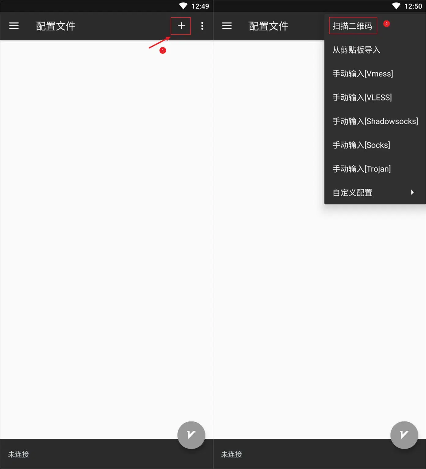 打开 V2rayNG 科学上网 APP,进入主界面,如下图所示。然后点击软件主界面右上角的 ➕ 号按钮会出现功能选项,然后选择扫描二维码(联系客服获取定制节点二维码)