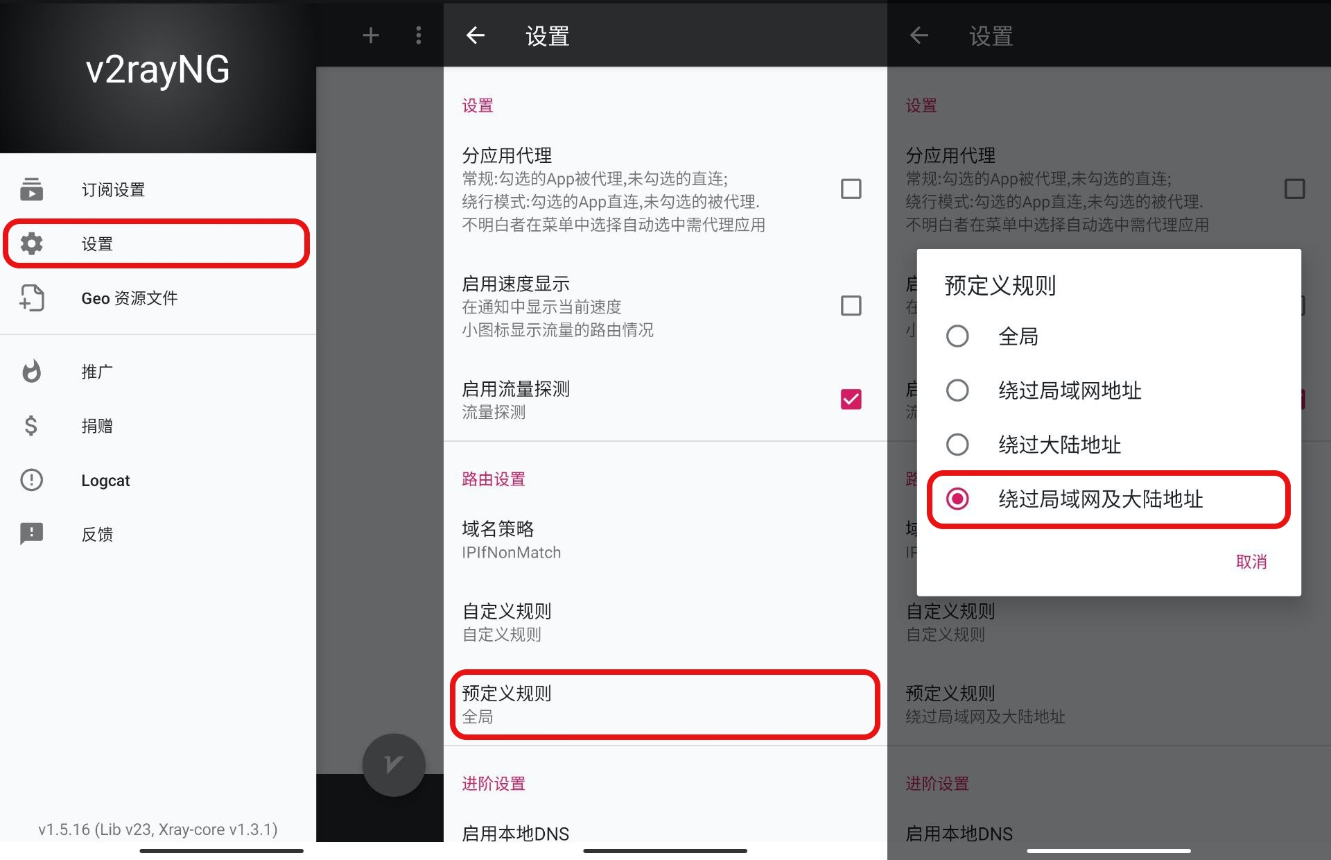 依次点击「设置」「预定义规则」,选择「绕过局域网及大陆地址」即可实现分流功能